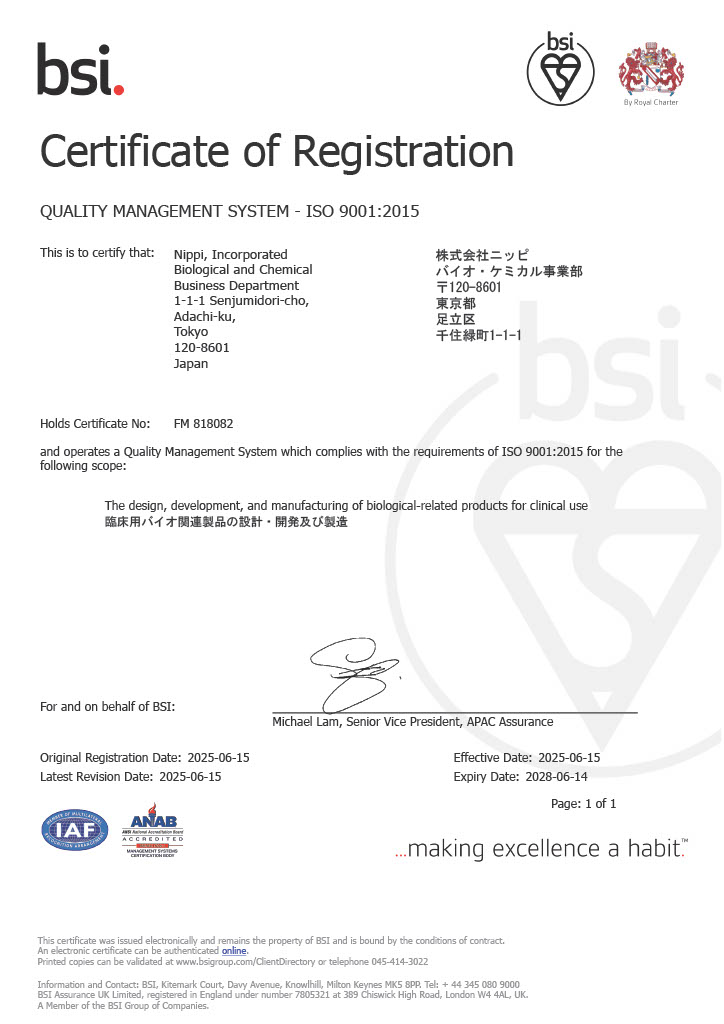 We are pleased to announce that Nippi, Inc., Biological and Chemical Business Department, has obtained certification for the international standard ISO 9001:2015 for its Quality Management System (QMS). This certification aims to enhance the production management system and product quality of iMatrix-511MG and iMatrix-221MG, which are intended for clinical use. With the acquisition of ISO 9001 certification, we are committed to continuously maintaining and improving our quality management system, while striving to further enhance customer trust and satisfaction.
