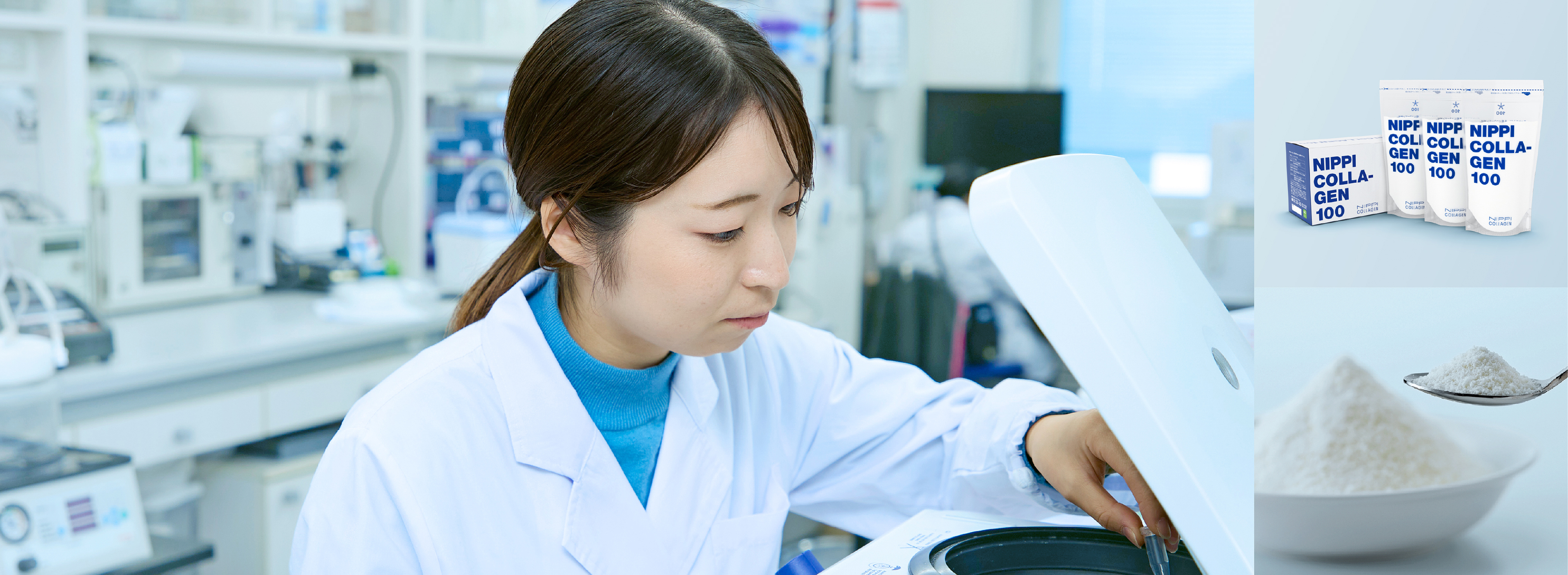 岩崎が所属するチームのリーダーである多賀祐喜は、「基礎研究という学問的な視点と、商品の素材となり得るコラーゲンの機能性の探究を結びつけるのは、個々人の発想や意欲です。地道な研究が実際の開発につながることにやりがいを感じています」と語る。ニッピの社風であるモノづくりへの意欲は、研究所にも息づいている。