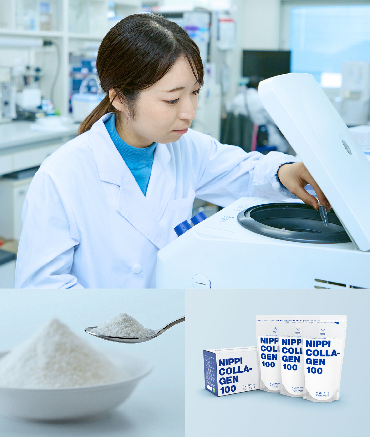 「コラーゲンペプチド」は、ゼラチンのように冷やすと固まることはなく水にすぐ溶け、食品の原料として使い勝手がよい性質を持つ。ニッピの高度な製造技術によって、無味無臭で高品質なコラーゲンペプチド原料の提供が可能となっている。さらに、その機能・効果がエビデンスによって明確になれば、コラーゲンペプチドの応用は、より幅広い分野へと広がっていく。